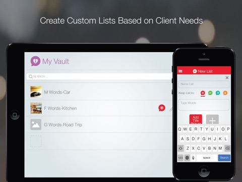 You can add your own custom words, phrases, pictures, and record your own audio for any list. Create and organize custom lists in My Vault to fit the individual needs of those you work with.