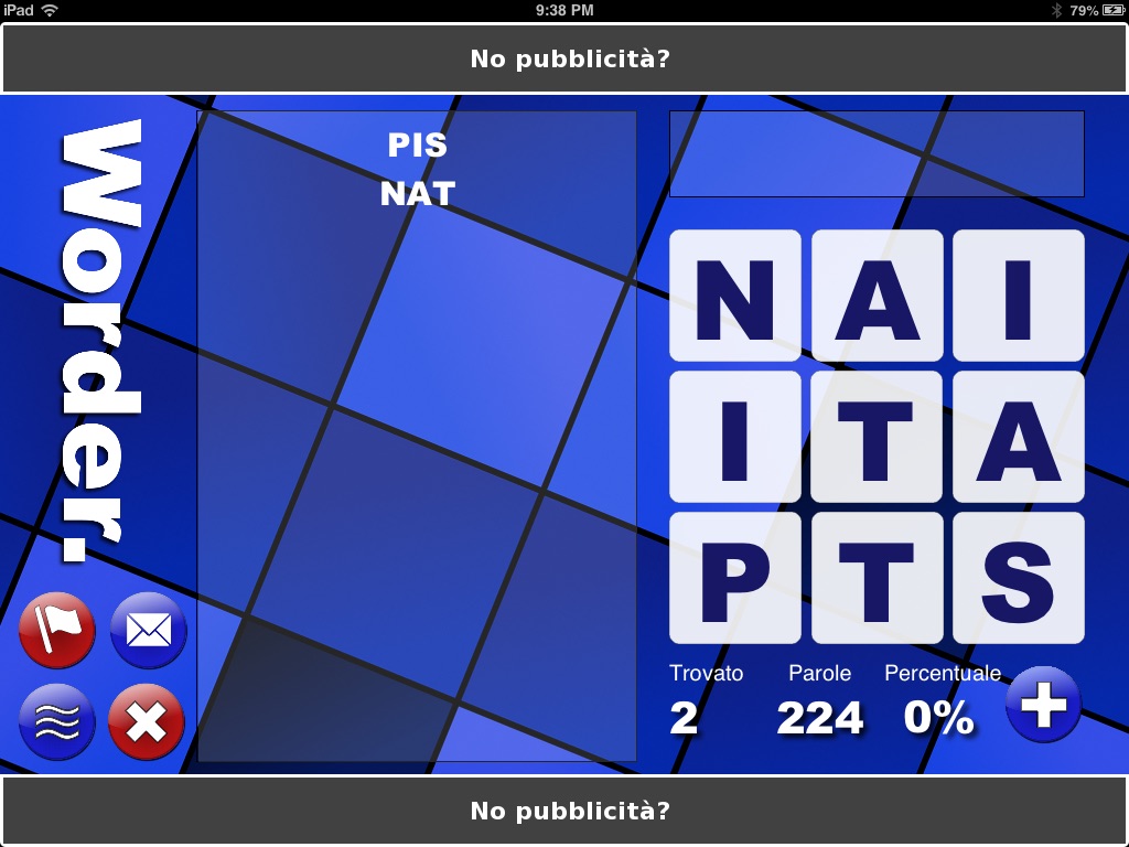 The game Worder involves guessing all the words that can be made from combinations of 9 letters. All the letters also make up one 9 letter word. This version of Worder uses an Italian dictionary. The interface is also in Italian.