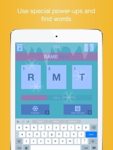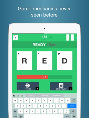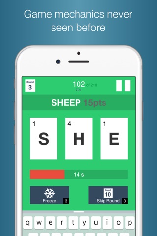 Once you fall behind, the Freeze and the Skip Round power-ups give you more time and better inspiration to rack up more points. Challenge your family, friends and worthy opponents in this word-hoard clash. It is your word-in-go against theirs.