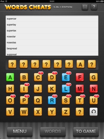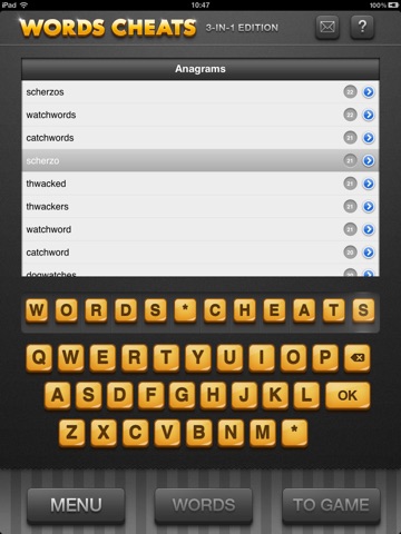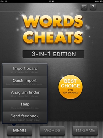 An ad-free, smart cheat app for the most popular games: Words with friends, Hanging with Friends and Scrabble. We automatically input the board and find the best moves for you! Now you can cheat or play jokes on your friends by making 80 point moves, or improve your skills using the built-in dictionary and anagram finder.