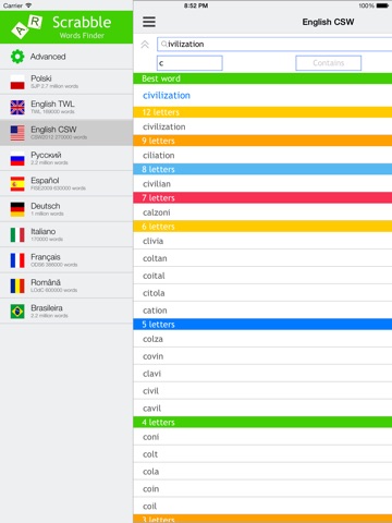 This is the easiest and the fastest way to find words containing given letters. The application is very useful and helpful with every type of Words Games. It contains dictionaries of 10 languages: polish, english TWL, english CSW, russian, spanish, german, italian, french, romanian, portugese. Every found word can be easly checked in the online dictionary.