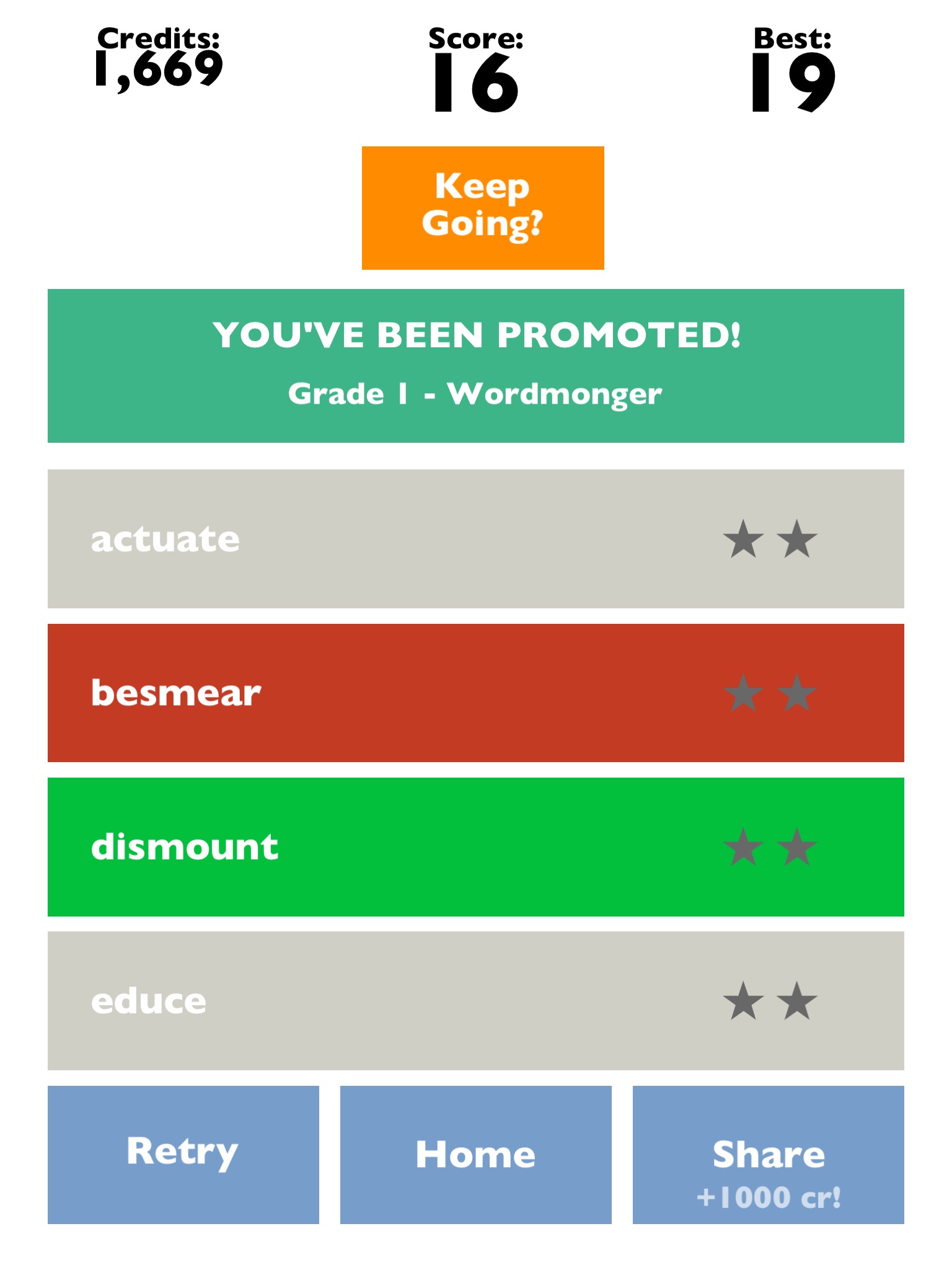 Advance through the 14 different grades of vocabulary mastery by accomplishing different challenges such as scoring a certain amount of points or mastering a number of words.