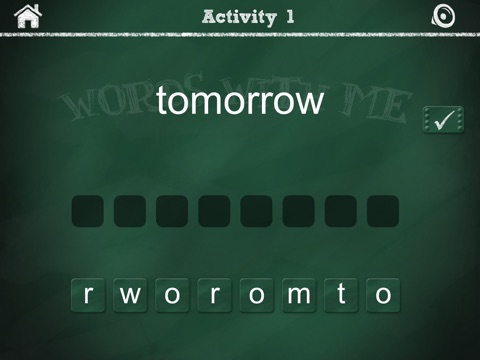 Activity – The Activity is unscrambling the word and is done in 3 levels. First level, the word is shown and the speaker icon will play that current word you recorded. Drag the letters to form the word and hit the check mark (which is movable). Second level, the word will disappear after 3 seconds. Tap speaker to hear and show word briefly. Third level, no word will be shown. Drag the letters to form word and hit check. If incorrect you must try again. Third level data will be recorded and shown in the Progress page.