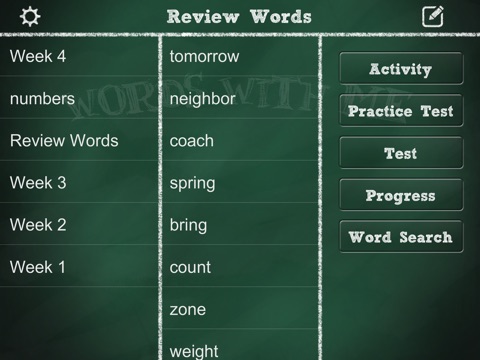 Choose your list. The list name is stated above the current list of words. Choose between Activity, Practice Test or Test.