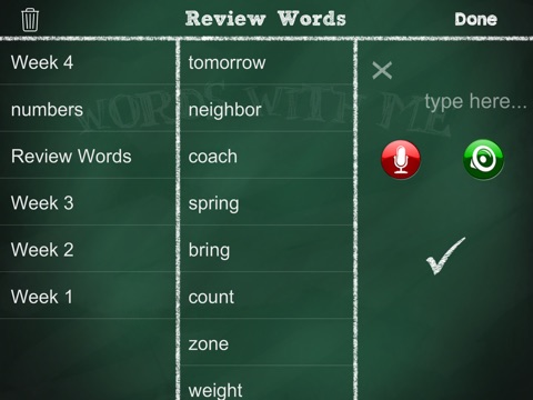 Practice Test – When you are ready you can take a practice test. Tap to start. Your recorded word will play and you must spell it correctly. After typing word hit Go on the keyboard. You will be notified if right or wrong. There will be no time limit and you advance to next word when ready.