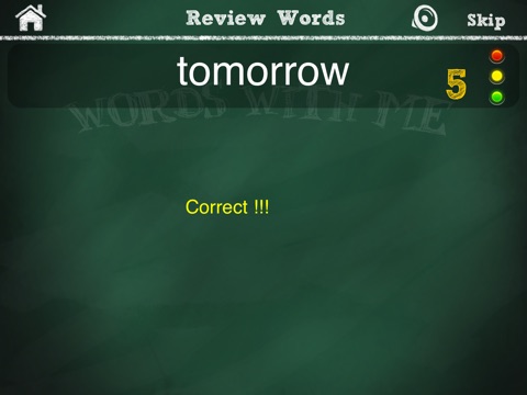 Test – Testing is the same as Practice Test, except you are timed. The moment the word is played the clock counts down (duration can be adjusted in Settings). If time expires the next word is in play. After you complete a word it will auto advance to next word, until Test is complete. This Test will show in Progress page.
