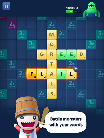 Schön gemachtes Scrabble als Kampfspiel gegen niedliche Monster.