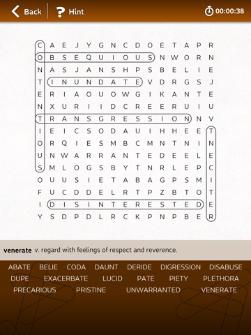 Astraware SAT Edition Wordsearches take this a step further by including the definition for each word, either when you tap on the word in the list, or when you find it in the grid. In this way both the word and the meaning are reinforced together.