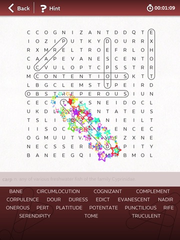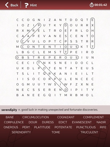 Astraware SAT Edition wordsearches take this a step further by including the definition for each word, either when you tap on the word in the list, or when you find it in the grid. In this way both the word and the meaning are reinforced together.