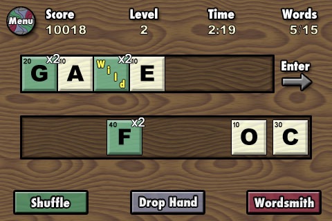 Use wilds and letters to form words as fast as you can. Create words with bonus multipliers for additional points. Get more points by forming words five, six, and seven letters long. Use the hot buttons at the bottom, to shuffle tiles, drop your hand, or automatically create words.