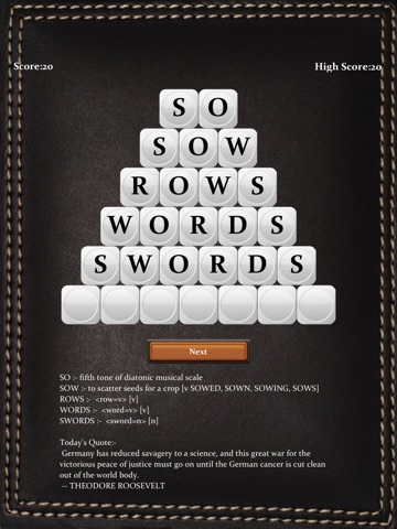 I like the concept of this game. I wish the app had more sophistication in tracking scores/levels, etc. The two letter combos seem to repeat each other very frequently and are not as random as implied in the description. Im undecided about the definitions shown at the end of each round. The player has used those words, so one would hope they know the definition already. The six-letter words do not show definitions, and Im not sure why. With a few improvements, this could be a very addictive game.
