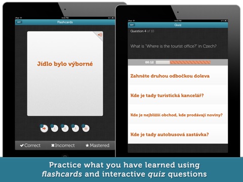 Test yourself with timed and interactive quizzes. Choose the number of questions in the quiz, and get a quick gauge on how well you have retained the Czech words and phrases learned.