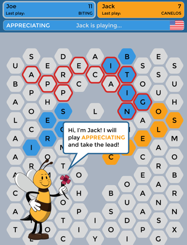 Wordy Bee is free to play, and is fun and challenging for any player! There are three board levels: Easy, Medium, and Hard. If you play alone against the Wordy Bee on your device, you can set it to one of three difficulty modes.