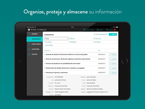 Work Guardian es un sistema gestión para despachos de abogados que organiza, protege y almacena su información en la nube, para que esté segura y disponible para usted desde cualquier dispositivo (ordenador, tablet o smartphone) y desde cualquier plataforma (windows, mac, android...).