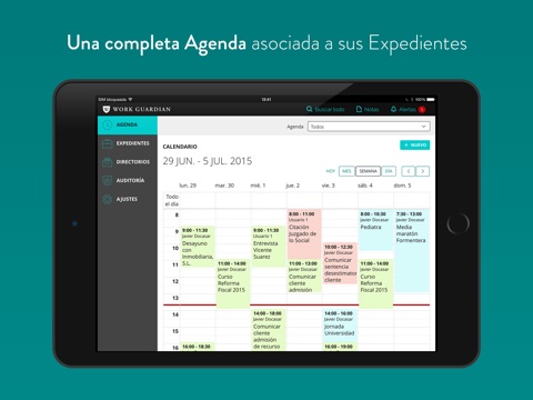 La completa agenda de Work Guardian le permite, fácilmente y de forma visual, asignar avisos a sus trámites, crear citas importantes y asociarlas a un expediente en concreto, asignar tareas profesionales o personales, crear alertas...