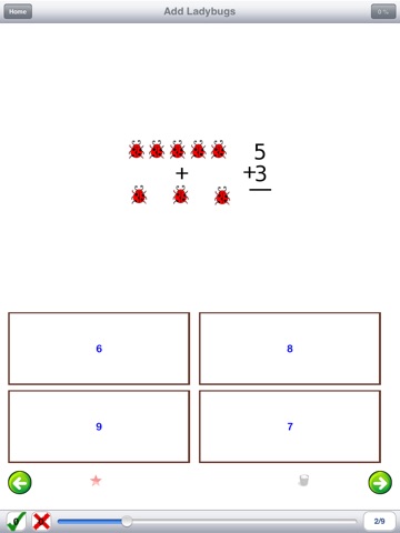 Questions are good and I like the multiple choice format, but what do we need all that empty green space for (iPad version)? Most of the questions are "squished" way up in the upper left-hand corner in small font. The graphics also are VERY small. There arent many graphics, but when they are used (ladybugs), they are so small its difficult for anyone (even children with itsy bitsy fingers) to count them. I wish I could give it a better rating, because the concept is good, but it needs some revisions first.