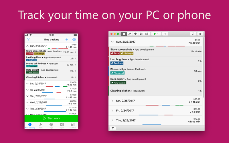 Easily track your work hours - organize, analyze and export them. Perfect for freelancer, hourly workers, employees or anyone else who wants to keep track of his or her working time. Completely without ads or subscription.
