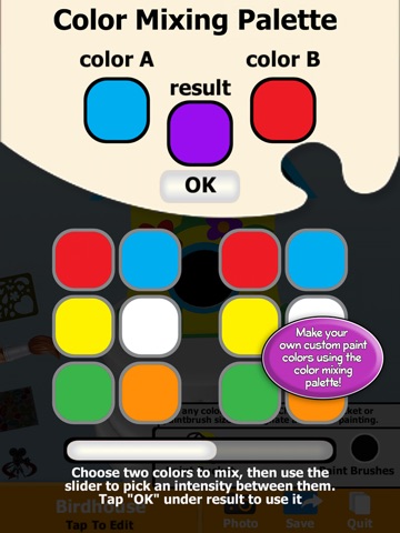 Can’t find your perfect color? Make it! You can mix two colors with the mixing palette. Use the slider tool to adjust the mixed color to your liking.