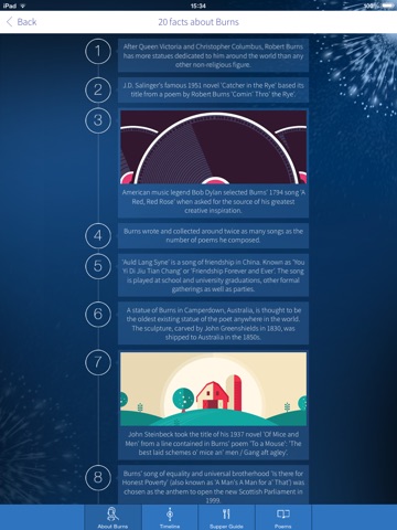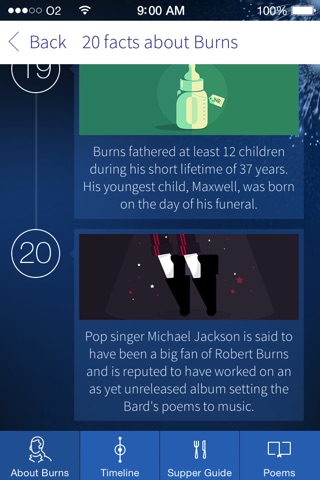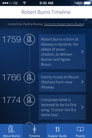 • A visual timeline of Robert Burns including articles on the key landmarks of his life and events commemorating him.