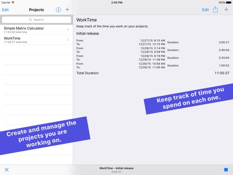 Working on one project or many? Need to keep track of time you spend working? WorkTime helps you manage each project and your work sessions in a very simple way: enter the name of your project and of the task you are working on and tap the start button to start recording.