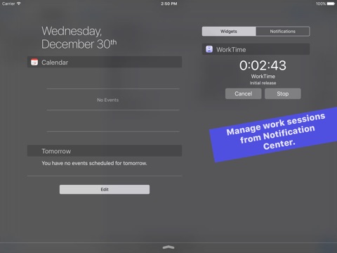 WorkTime keeps the sessions separated by projects and tasks, or parts of the projects, so you can manage them more easily across all your devices thanks to iCloud synchronisation. You can manage the recording of a session from inside the app or more easily from Notification Center, even from different devices.