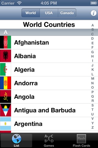 When the app is opened, it immediately opens to a list of world countries. A switch at the top lets you switch to US States or Canadian Provinces. Conveniently select any country, state, or province to see its flag and capital city, and to explore it on a map or in encyclopedia articles. Learn at your own pace!