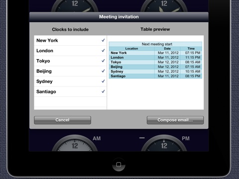 Tap the calendar icon in the Converter/Meeting Planner window or after scrolling the map on the main screen (iPad only) and compose a mail with a neat time table for a meeting.