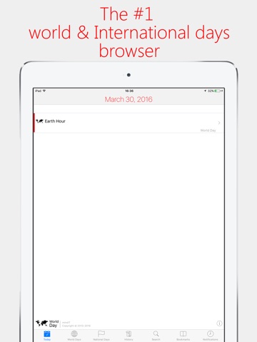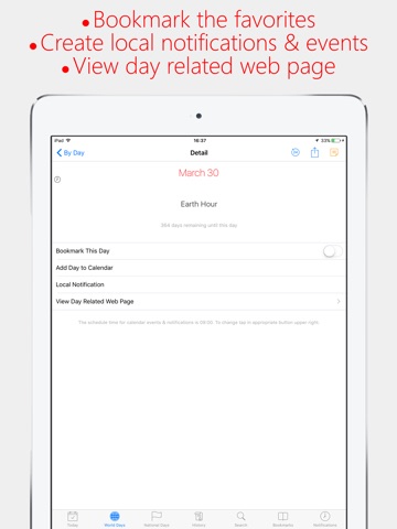 The World Day is an international days browser including national anniversaries and religious observances. View the current the world day (on a daily basis), browse by month or by date, search using criteria, view day related website and information, bookmark the most important for you and view the upcoming world days, national anniversaries and all religious observances. You can also add an event for a world day in your calendar or schedule local notifications in your device for a day.