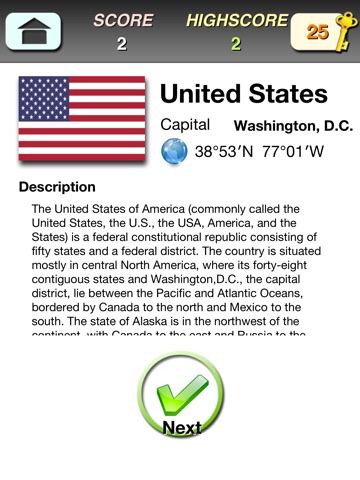 ★☆★ This quiz game is very interesting and absorbing and playing method is giving the correct answer to worldly informations - flag, country, capital.