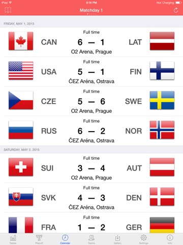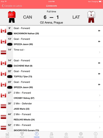 Using "World Hockey 2015 - All Goals" you also get immediate access to the Tournament table, Teams, Events in Matches, News, Statistics and Video.