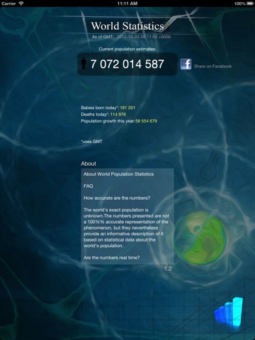 What app gives you and what the name would indicate is misleading. No population stats for individual countries just a constantly running population stat clock for the world. Not worth the dollar. Dont buy!