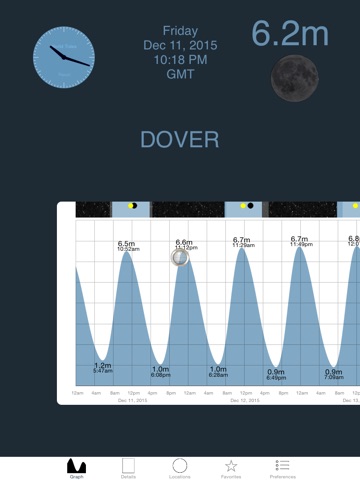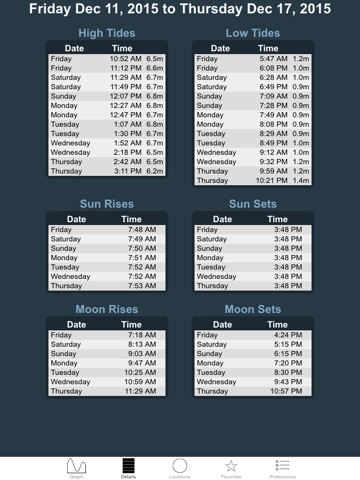 Features: Moon/Sun Rise/Set times, large slidable zoomable tide graph, recent locations, built in zoomable map, search, details page, and manual time offset override option.