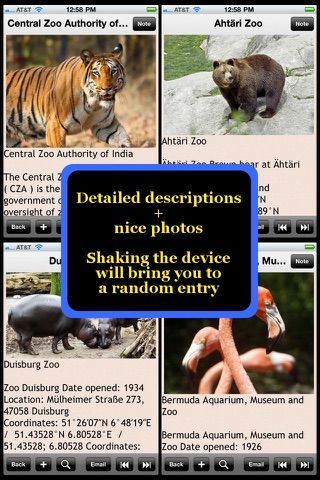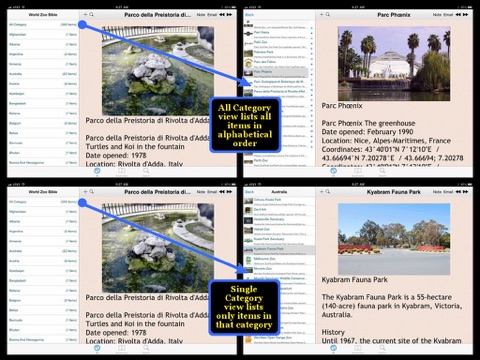 World Zoo Bible is an application that contains detailed information of over 240 zoos to visit in the world. The zoos are categorized by their countries for easier reference. Each entry contains the following information: