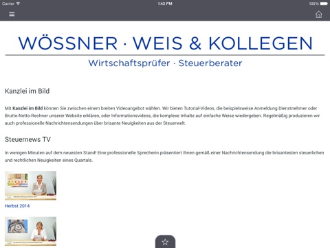 Mit unserer App für iPhone, iPad und iPod touch wollen wir Ihnen die absolute Mobilität bieten. Nach dem Download unserer App stehen Ihnen umfangreiche Informationen und unsere praktischen Onlinerechner auch mobil zur Verfügung. Wir halten Sie über Neuheiten aus unserer Kanzlei und über Steuernews auf dem Laufenden.