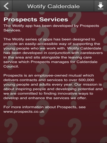 Wotify? is an app for young people which answers all the important questions in life. Providing answers to questions about money, health, relationships and many other areas, the app provides the answers and links to almost 100 "Wotify "questions . Designed by Prospects for care leavers in Calderdale the app can help young people everywhere to get the answers they need.