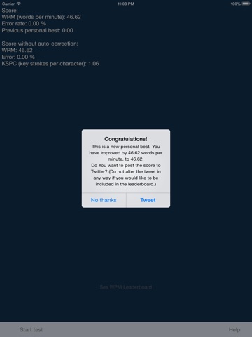 Posting to twitter not only makes it easy to keep track of your own progress, it also lets you see how others are doing, which is motivational. (Search for the hashtag #wpmiphone.) But youre not forced to post your scores to twitter, so Im not sure what the other people are complaining about. The app does what it says: it gives you a scientific measure of your typing speed.