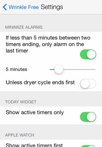 With the minimize alarms option, you wont get too many alarms. It works like this: If you have two timers that are ending close to one another, you can choose to only receive one alarm instead of two when the last timer expires. Unless, of course, the dryer is finishing first, in which case youll get both alarms. After all, we do want you to be wrinkle-free.
