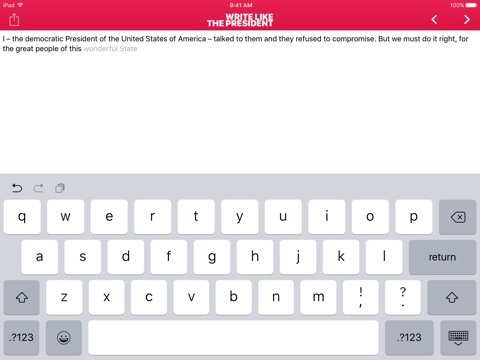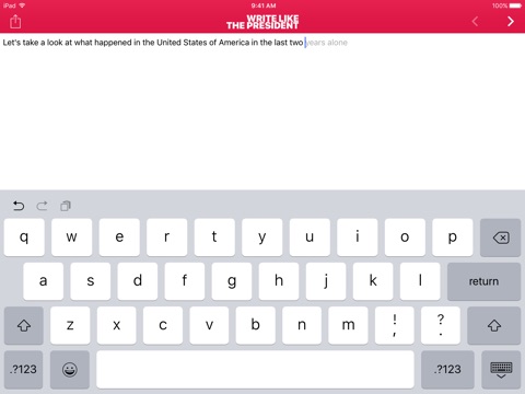 This intuitive text prediction assistant predicts what to write next in the language and the style of a US President. Take advantage of their expertise and talent to help you write error free emails, speeches, essays, or business letters.