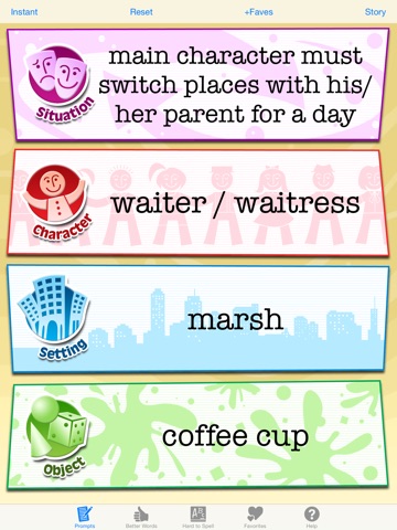 Boost students creative writing skills with writing prompts that will spark their imaginations. This writing prompt generator is quick and easy to use; your students will have an inspiring writing topic in seconds. Just tap the screen to pick a situation, a character, a setting, and an object.