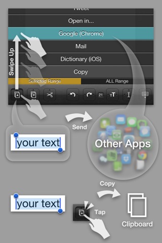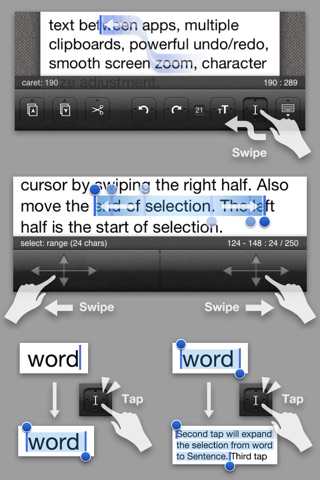 売りである編集サポート機能は使いやすいですね。私はiPhoneにおける文字列選択が下手なので、このアプリの選択機能がiOS標準になればいいのにと思うくらい。 1ドキュメントしか扱えない点や、外部連携の不親切さは少々難ありです。 しかしアプリの説明にも記載がありますとおり、メモというよりは推敲用のアプリと割り切れば及第点ではないでしょうか。 私としてはやはりメモアプリとしてDropboxとシームレスに同期してくれたら完璧なのですが、そんな身勝手な期待も含めつつ、バージョンアップを待ちわびたいと思います。