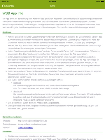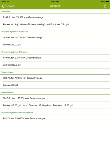 Die App dient zur Berechnung bzw. Kontrolle des gesetzlich möglichen Verschnittanteils an bezeichnungsschädlichem Fremdwein unter Berücksichtigung einer oder zwei verschiedener Süßreserven (bezeichnungsgleich und/oder bezeichnungsschädlich). Gleichzeitig gibt die App einen Vorschlag über die Höhe der Süßung mit Süßreserve. Dies wird nach Eingabe des Glucosegehaltes durch Berechnung des Glucose-/Fructoseverhältnisses approximiert.