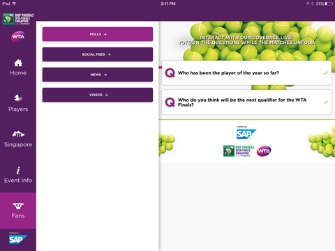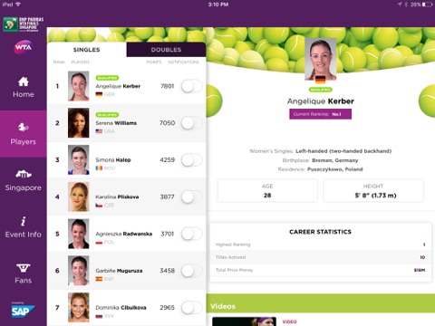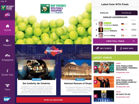 With the WTA Finals mobile app for iPhone and iPad, fans can get closer to the tournament action with real-time scores, news, statistics, draws, player profiles, schedule, videos, and more. Taking place October 23rd to 30th, 2016, the BNP Paribas WTA Finals Singapore presented by SCGlobal features the tennis world’s best eight qualified singles players and doubles teams. Stars such as Simona Halep, Serena Williams, and Angelique Kerber are likely contenders in this year’s event. Don’t miss it!