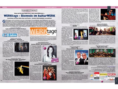 Nach dem kostenlosen Herunterladen der jeweiligen Ausgabe darf das Durchblättern durch die Westerwälder Veranstaltungswelt gestartet werden. Optisch entspricht die digitale Ausgabe der Print-Ausgabe. So findet der Leser im vorderen Teil der Ausgabe chronologisch angelegt, zahlreiche Veranstaltungstipps der kommenden Wochen mit überregionalem Charakter. Neben Veranstaltungen aus der Westerwaldregion findet man hier nicht selten auch Highlights aus den angrenzenden Regionen Siegen, Koblenz oder Limburg.