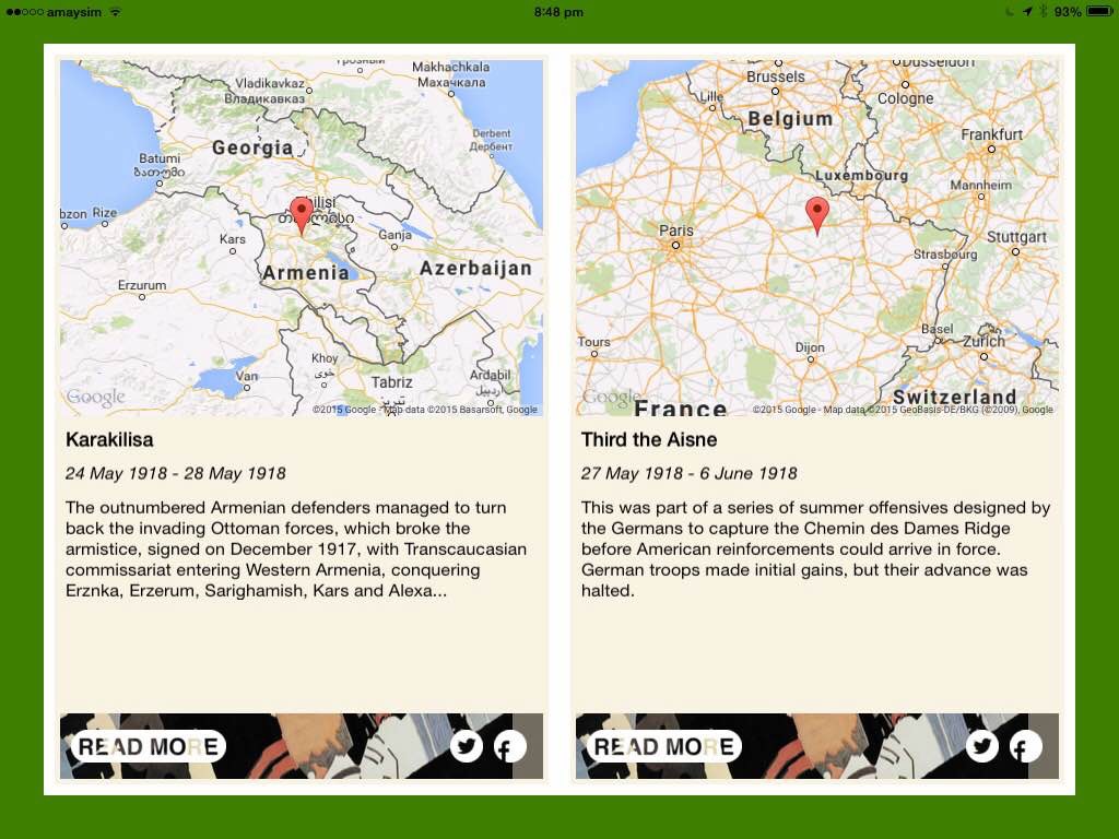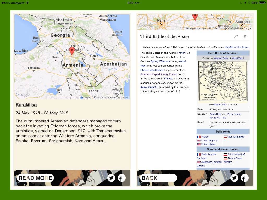 Each page shows the date, a succinct description, a zoomable map for the event and a link to the a detailed Wikipedia article. After a particular event?