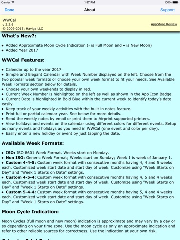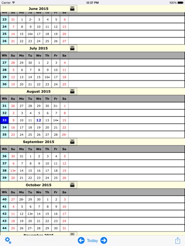 WWCal provides a simple and elegant scrolling calendar with week number for each week displayed on the left. The current week and date are highlighted in blue and weekends are displayed in red to differentiate between week days and week ends. The current week is also shown on the app icon badge to show the week without opening the app. If you do not want badge icon to show current work week, please turn off badge notification inside the Settings app for WWCal.