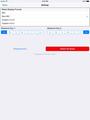 WWCal allows you to set your calendar to show ISO 8601 based weeks (starting on a monday) or the general week layout (weeks starting on a sunday). If both of these formats does not suite you, you can even setup your own CUSTOM week format with any start date and any start day of week as you choose. Very useful if you use a fiscal calendar that is different than the yearly calendar.