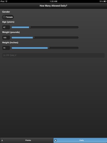 This app shows how many points u are allowed to have but it doesnt help u track how many u have eaten and how many u have left. This is very inconvenient. Dont like the app