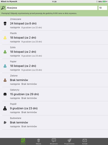 - ustawienie alarmu przypominającego o zbliżającym się terminie wywozu odpadów,