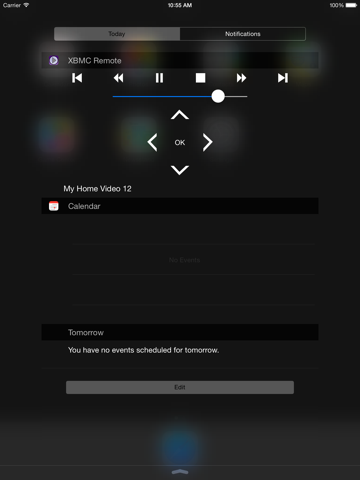 Remote control widget for XBMC / Kodi. Easily control your XBMC or Kodi media center from your iOS device directly from the today view. No need to load a separate app just to pause, skip or change the volume, simply swipe down to view the widget and use the customizable remote to control to access XBMC/Kodi.