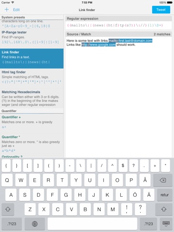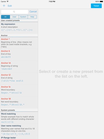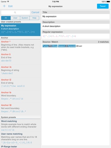 Xeger is design for your need to solve problems using regular expressions on either your iPad or your iPhone.